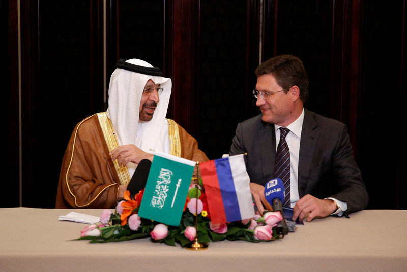Le ministre saoudien de l’Energie, Khalid al Falih, et son homologue russe, Alexandre Novak, se sont engagés à « faire tout ce qu’il faut » pour réduire les stocks mondiaux et les ramener à leur moyenne de cinq ans. Ils reprennent ainsi la formule employée au cours de l’été 2012 par le président de la Banque centrale européenne (BCE), Mario Draghi, pour afficher sa détermination à sauver l’euro.